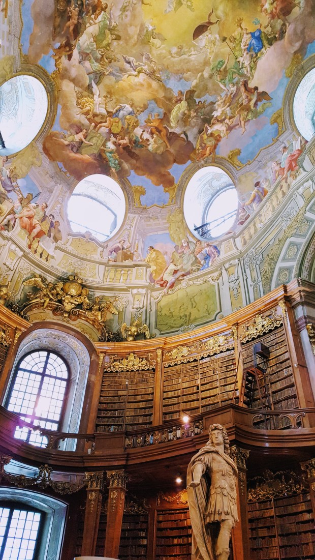 Bücherregale aus dunklem Holz, die sich über zwei Etagen bis zu einer prächtig bemalten Decke erstrecken – die Bilder, die ich bei der Vorbereitung für meine Interrail-Reise vom Prunksaal der Österreichischen Nationalbibliothek gesehen habe, waren viel versprechend. Und meine Vorfreude sollte belohnt werden, denn de9r barocke Bibliothekssaal hat mich direkt in den Bücherhimmel katapultiert.